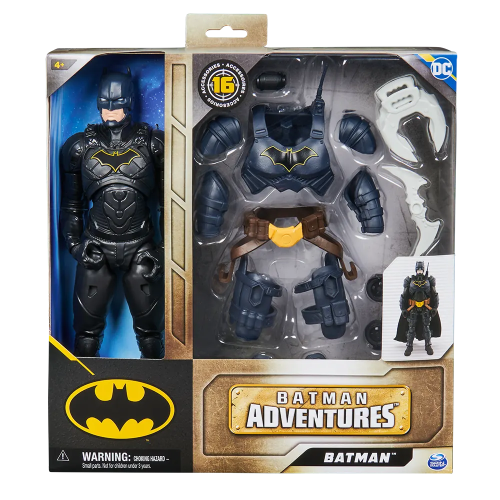 Incluye: 1 escenario, 1 figura de Batman, 6 piezas de armadura de Batman, 1 gancho, 4 paneles de cartón prensado, 1 hoja de calcomanías, 1 guía de instrucciones.