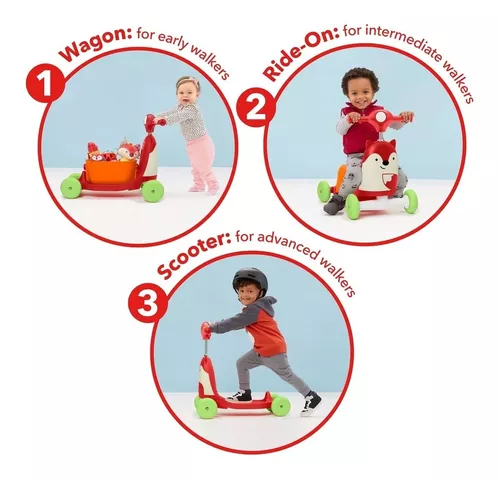 La primera etapa, está diseñada para los primeros caminantes, motiva a los pequeños a empujar y tirar en modo carreta, ofrece también un gran lugar para sus juguetes favoritos. En la etapa dos, el canasto se convierte en un asiento para el modo de paseo. ¿Listo para la etapa tres? ¡Simplemente retire el asiento, levante la manija ajustable, súbase al scooter y llévelo a dar una vuelta! Les encantará jugar el botón de faro, melodías, pitido y efectos de sonido más divertidos.