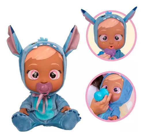 ¡Descubre los nuevos Cry Babies inspirados en Stitch de Disney! Puedes vestirla con su atuendo personalizado: el icónico vestido de Stitch y un par de zapatos. Cuando le quites el chupete de la boca, ella comenzará a llorar lágrimas de verdad. Como se siente tan triste sin su chupete, hará sonidos de llanto realistas... ¡como lo hace un bebé de verdad! Los niños deben volver a poner su chupete para evitar que llore. Además, los niños pueden cuidar de Stitch alimentándola con su biberón favorito.