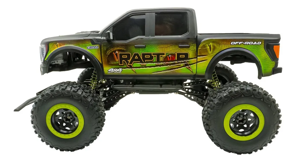 Su imponente diseño inspirado en la Ford F-150 Raptor, con detalles realistas y acabados deportivos en color verde metalizado con gráficos de alto impacto, lo convierte en un modelo llamativo y resistente. Los neumáticos sobredimensionados con gran agarre aseguran estabilidad y control en cada maniobra.