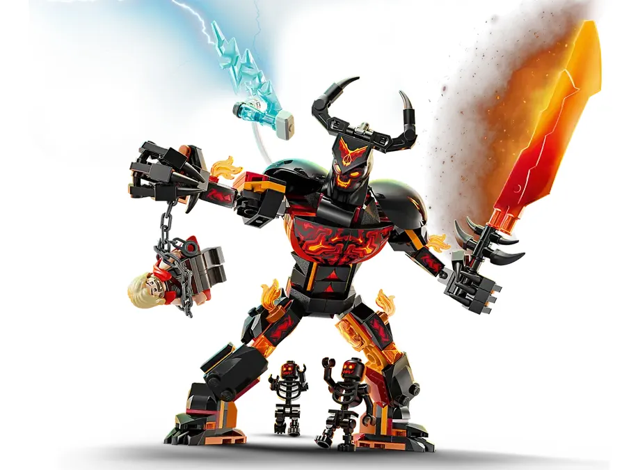 Juguete de personaje Marvel para construir: incluye una minifigura de Thor y 2 minifiguras de demonios de fuego, además de una gran figura articulada de construcción de Surtur que sostiene una espada de fuego y usa una corona con cuernos.