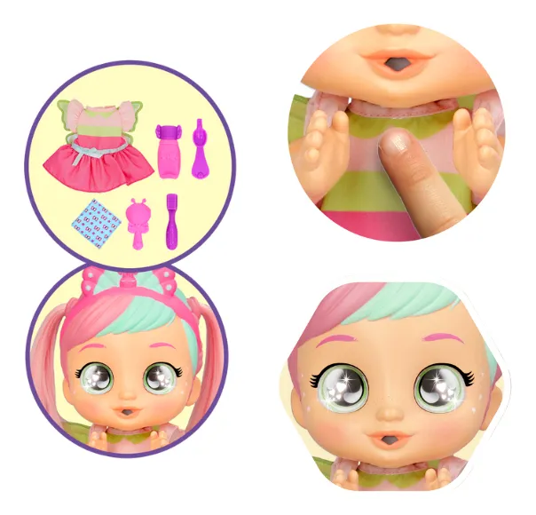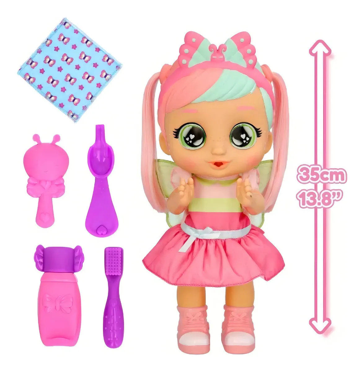 Incluye una variedad de accesorios que enriquecen la experiencia de juego, como un cepillo de dientes, un cepillo de pelo, una cuchara, un par de alas, pasta de dientes, una toalla de rostro y un vestido. Estos elementos permiten a los niños interactuar y cuidar de su muñeca, promoviendo habilidades de responsabilidad y cuidado. La muñeca no es articulada, lo que la hace más segura y fácil de manejar para los más pequeños.