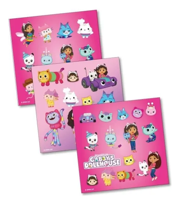 Incluye un bolígrafo y tres hojas de pegatinas con los personajes de la serie La casa de muñecas de Gabby.