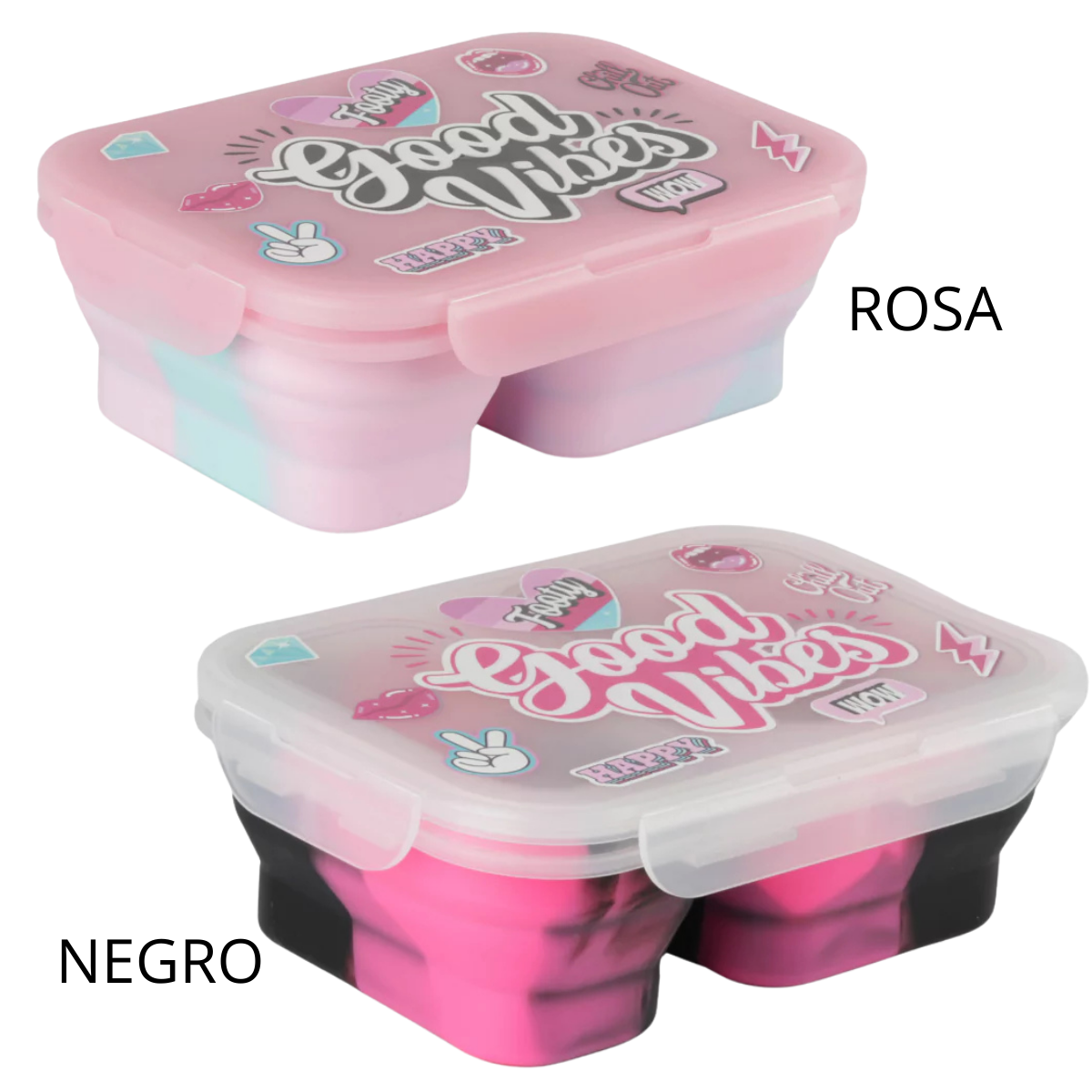 Contenedor plegable de silicona, con sistema de cierre clip hermético.