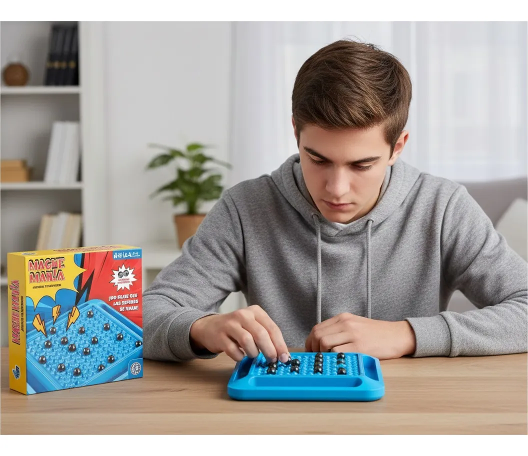 Este juego de destreza Magne Mania desafía la coordinación y la concentración de los chicos mediante 32 esferas magnéticas que deben mantenerse separadas mientras avanzan por el tablero. Es una propuesta divertida, segura y perfecta para compartir en familia con supervisión de un adulto. El diseño del tablero permite diferentes niveles de dificultad según la edad, ayudando a desarrollar motricidad fina, paciencia y pensamiento estratégico. Fabricado en materiales resistentes y adecuados para niños, pensado para un uso responsable y entretenido. + 14 AÑOS