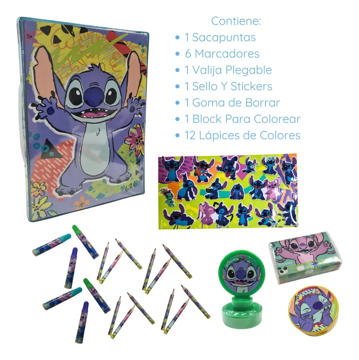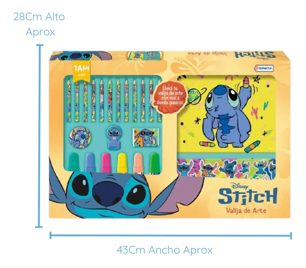 Despierta la creatividad de tus pequeños con el encantador Maletín Para Colorear Stitch. Esta completa valija de arte de Disney Tapimovil es ideal para fomentar el arte y la imaginación en los niños, ofreciendo todo lo necesario para disfrutar de horas de diversión creativa. Contenido del set: 1 Sacapuntas: esencial para mantener los lápices listos para usar. 6 Marcadores: con colores vibrantes para dar vida a cada obra maestra. 1 Valija Plegable: práctica y fácil de transportar, permitiendo que el arte acompañe a tus hijos a todas partes. 1 Sello Y Stickers: complementos divertidos para personalizar y decorar sus creaciones. 1 Goma de Borrar: elimina cualquier error y permite perfeccionar cada dibujo. 1 Block Para Colorear: con páginas diseñadas para inspirar la creatividad. 12 Lápices de Colores: una paleta de colores completa para explorar y experimentar. Este maletín proporciona herramientas de alta calidad y promueve el desarrollo de habilidades motoras finas y la expresión artística. Deja que tus niños exploren el mundo del color con Stitch, su personaje favorito. Perfecto para uso en casa, en la escuela o durante viajes, es un set imprescindible para cualquier pequeño artista en crecimiento.