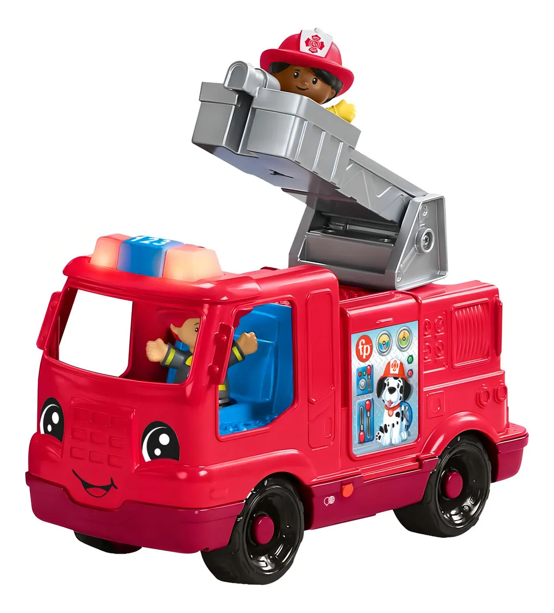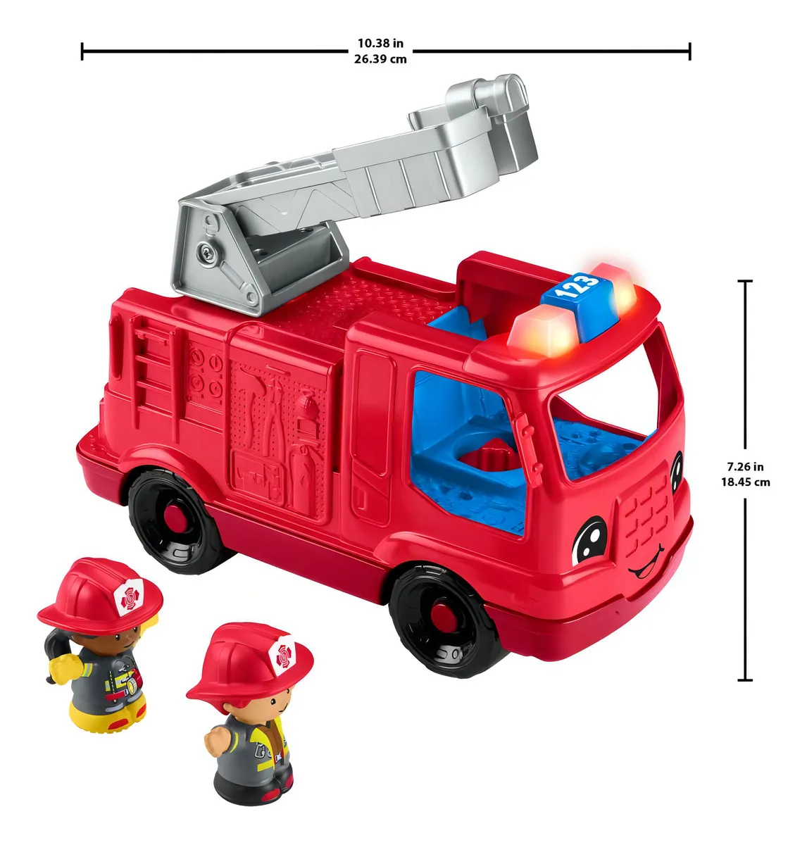 Vehículo Fisher Price Little People Camión de Bomberos Musical - Descripción: Este vehículo musical para empujar cuenta con luces divertidas, sonidos realistas, canciones y frases para cantar, además de una escalera que los niños pueden levantar y girar mientras juegan. El Camión de Bomberos incluye dos figuras de bomberos que pueden viajar, una en el asiento del conductor y otra sujeta a la parte trasera del vehículo, para divertirse contando historias. Usa el botón del globo terráqueo para seleccionar un idioma: inglés, español, francés o portugués brasileño. - Tipo de Embalaje: Caja - Pilas: No - Material: Plastico - Edad minima recomendada: +3 años