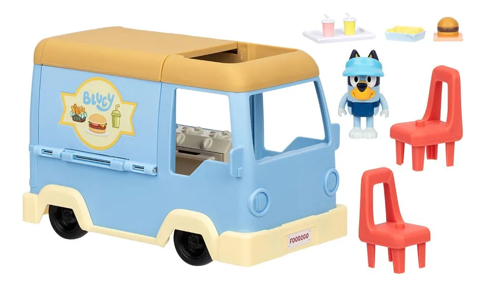 Bluey Food Truck es un juguete transformable 2 en 1 que invita a los chicos a recrear escenas del show y vivir aventuras gastronómicas con la familia Heeler. Este camión de comidas rápidas se puede empujar como vehículo y también abrirse para convertirse en un restaurante completo. El set incluye figuras exclusivas de Bingo y Bandit, diseñadas con brazos y cuerpo móviles para mayor realismo en el juego. Los chicos podrán imaginar que cocinan, sirven y disfrutan de las comidas más divertidas de la serie, fomentando el juego simbólico, la creatividad y la narración de historias. Ideal para niños y niñas a partir de 3 años, este playset combina lo mejor de los vehículos y escenarios en un solo producto, y se complementa con otras figuras y sets de Bluey para ampliar la colección.