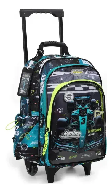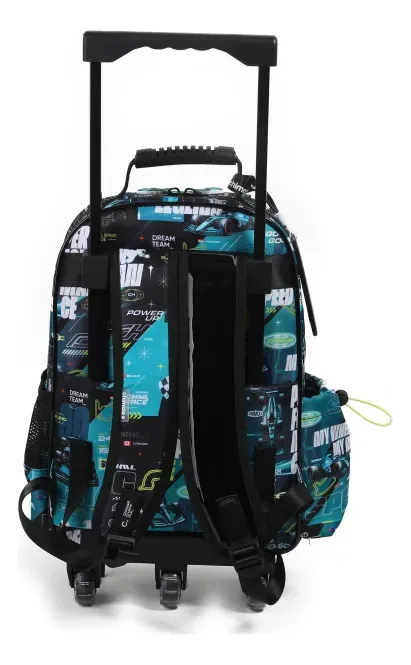 Una mochila pensada para quienes viven la adrenalina, el diseño y el movimiento sin pausa. Esta versión XXL inspirada en la F1 combina funcionalidad con un universo gráfico lleno de velocidad y estilo. Su frente crea un efecto de pista en movimiento con profundidad y contraste, mientras que los apliques de goma y las texturas brillantes y mates le suman un look óptico impactante. Tiene 2 compartimentos principales y un bolsillo frontal amplio, perfectos para organizar todo con comodidad. Sus laterales —uno con solapa y otro ajustable— te permiten llevar tu botella siempre a mano. Además, incluye pullers de goma con el personaje y un tag personalizado para tus datos. Su carro reforzado con ruedas de silicona asegura un andar cómodo, y las correas acolchadas permiten llevarla también de esta forma. Medidas: 31,5x45,5 cm; profundidad: 19,5 cm