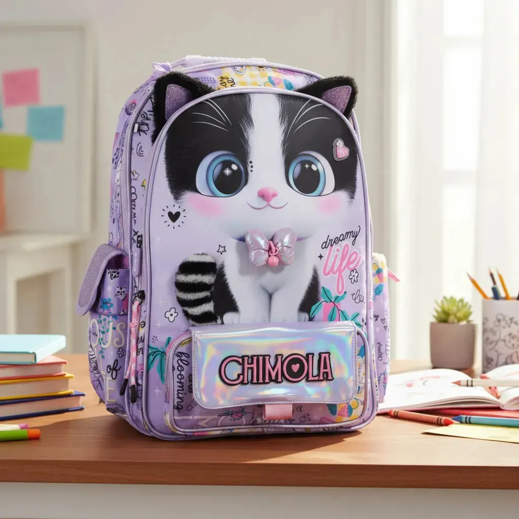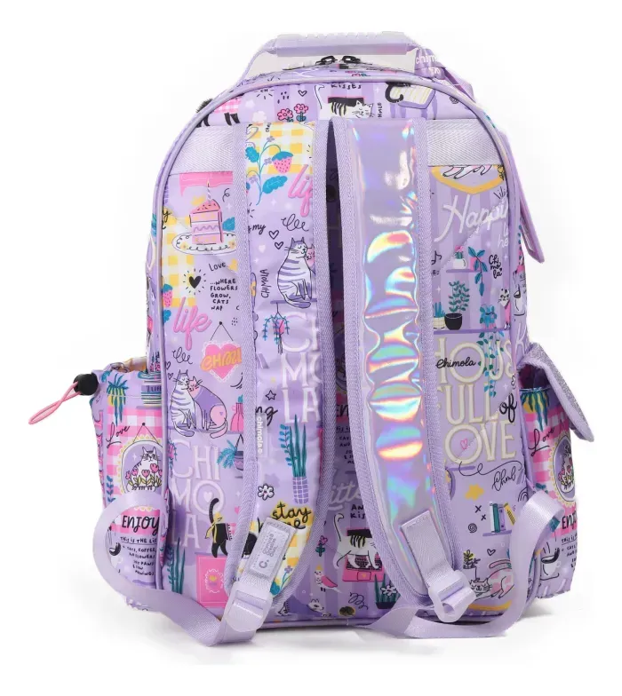 Esta mochila es super XXL inspirada en una tarde de té con detalles encantadores, combina practicidad con un universo mágico. Tiene 3 compartimentos principales y un bolsillo frontal amplio con terminaciones holográficas y una textura brillante. Su moño con campanita colgante suena suavemente al andar, y las orejitas peluditas con brillos le dan un toque único que roba miradas. Está confeccionada en tela impermeable, ideal para el uso diario, e incluye bolsillos laterales —uno con solapa y otro ajustable— perfectos para tener tu botella siempre a mano. Los pullers de goma del personaje suman un guiño lúdico, y el tag personalizado te permite llevar tus datos con estilo. Medidas: 31,5x45,5 cm; profundidad: 19,5 cm