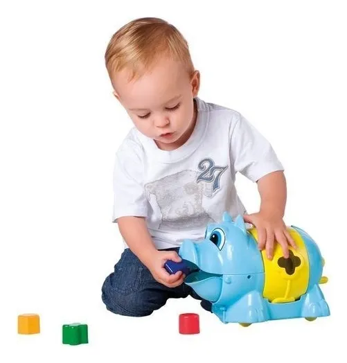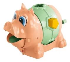 Este juguete cuenta con cinco piezas distintas para encajar. Al tocar la colita del chanchito, puedes hacer girar su panza!