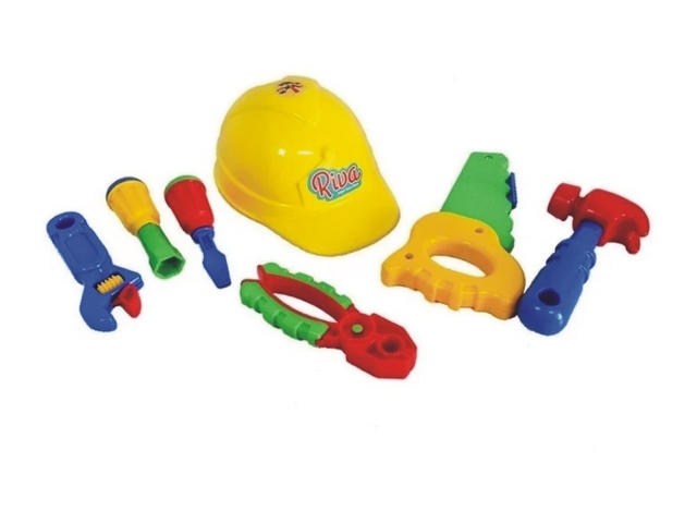 Herramientas con estupendos colores para crear, armar y desarmar! El juego incluye casco, pinza, destornillador, llave de tubo, llave inglesa, serrucho de mano, que hace ruido al igual que el real, martillo, tornillos y tornillos-tuercas.