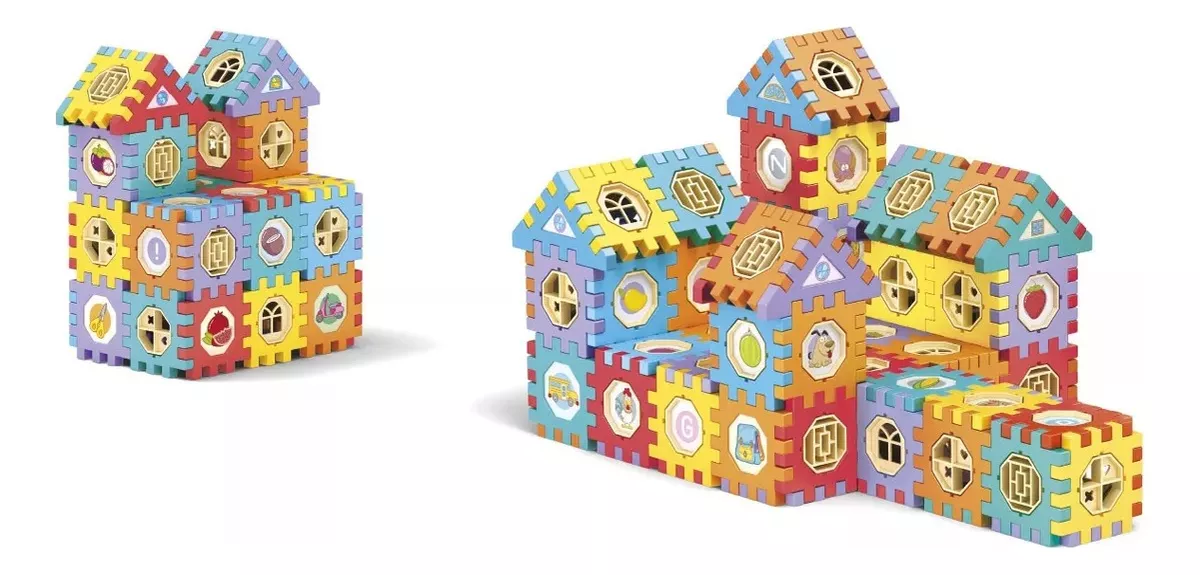 Incluye: 1 instructivo, 36 ventanas,mas 36 ventanas para stickers,16 bloques triangulares,60 bloques para ventanas, 24 bloques para stickers, y 5 planchas de stickers.