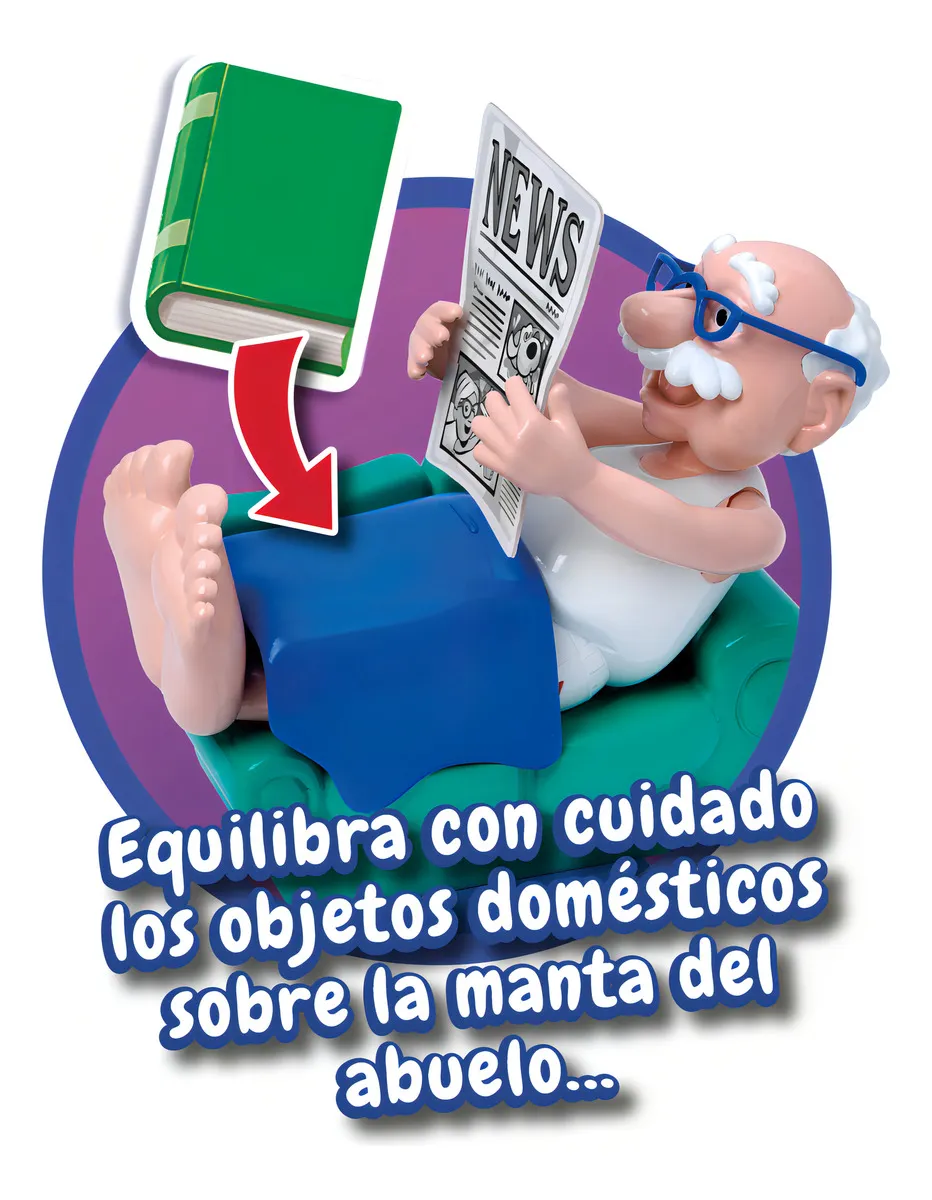 ¿Puedes apilar y hacerle cosquillas sin que se caiga? Pon un objeto en equilibrio sobre el abuelo y hazle cosquillas en los dedos de los pies, pero cuidado... si le haces cosquillas demasiado, no podrá controlarse. ¡Su periódico y su manta saldrán volando, lanzando tus objetos por todas partes! El primer jugador que apile todos sus objetos sobre el abuelo sin asustarlo será el ganador.