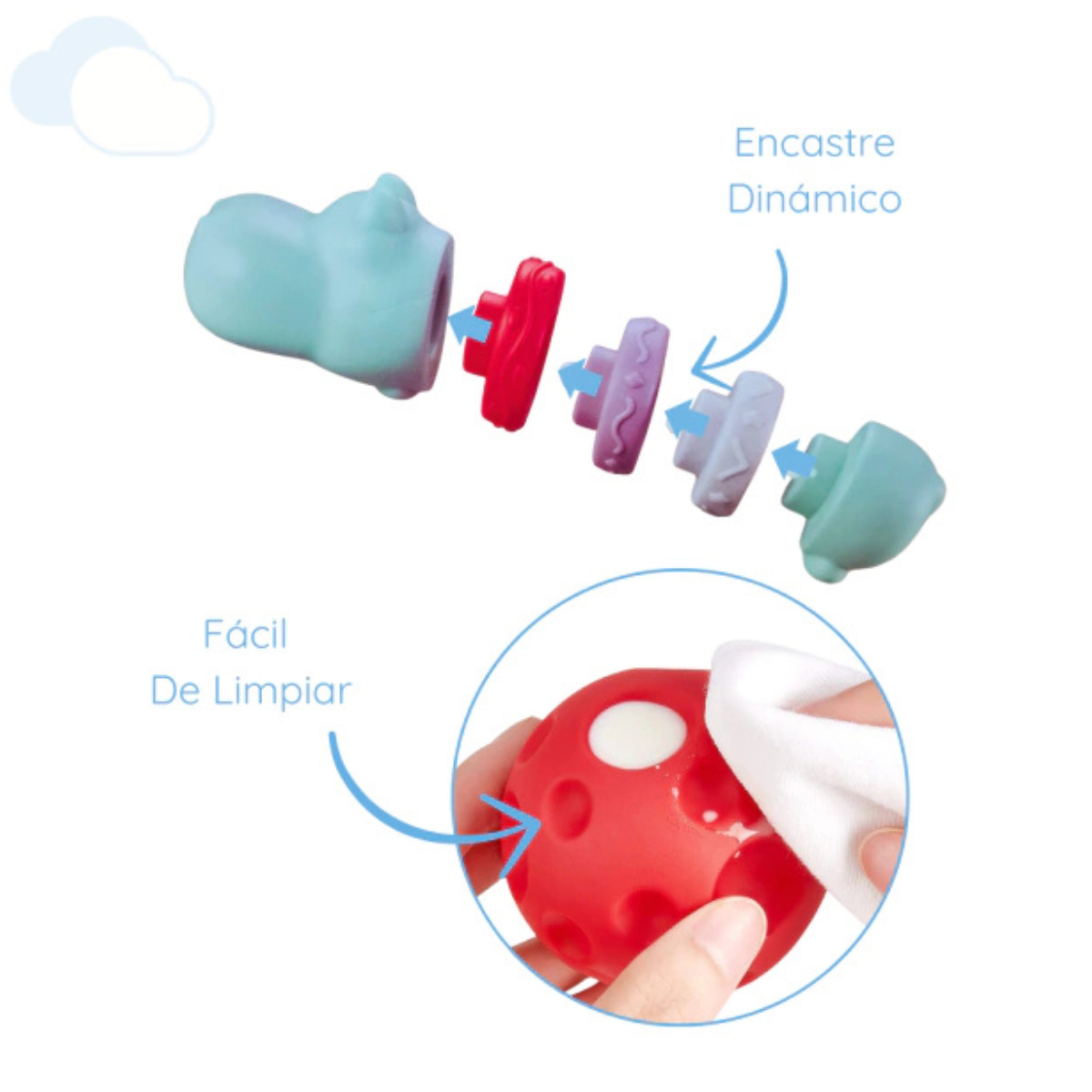 Descubre el juguete en forma de un tierno hipopótamo que transformará la hora del baño de tu bebé en una experiencia divertida y educativa. Este encantador hipopótamo es uno de los amigos infaltables a la hora del baño, diseñado especialmente para estimular el desarrollo de la motricidad fina de tu pequeño.