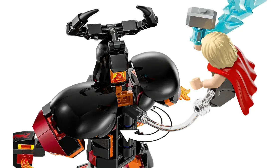 Juguete de personaje Marvel para construir: incluye una minifigura de Thor y 2 minifiguras de demonios de fuego, además de una gran figura articulada de construcción de Surtur que sostiene una espada de fuego y usa una corona con cuernos.