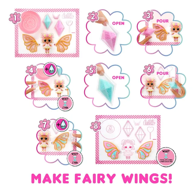 ¡Explora la magia de las hadas con las increíbles L.O.L. Surprise Fairies Tots! Cada muñeca incluye alas de cristal personalizables y accesorios de moda que ofrecen una experiencia única, creativa y mágica. Abre la bola para descubrir tu muñeca sorpresa, alas de hada, un kit especial con polvo de cristales y encantadores accesorios. Personaliza fácilmente las alas extendiéndolas sobre el tapete incluido, esparciendo dos colores de cristales mágicos, y utilizando la pipeta en forma de corazón para fijar tu diseño con agua. ¡En solo dos minutos tendrás unas alas brillantes listas para jugar! Además, cada muñeca tiene un adorable atuendo y peinado exclusivo. Cuando termines de jugar, usa la bola como soporte para exhibir tu creación mágica.