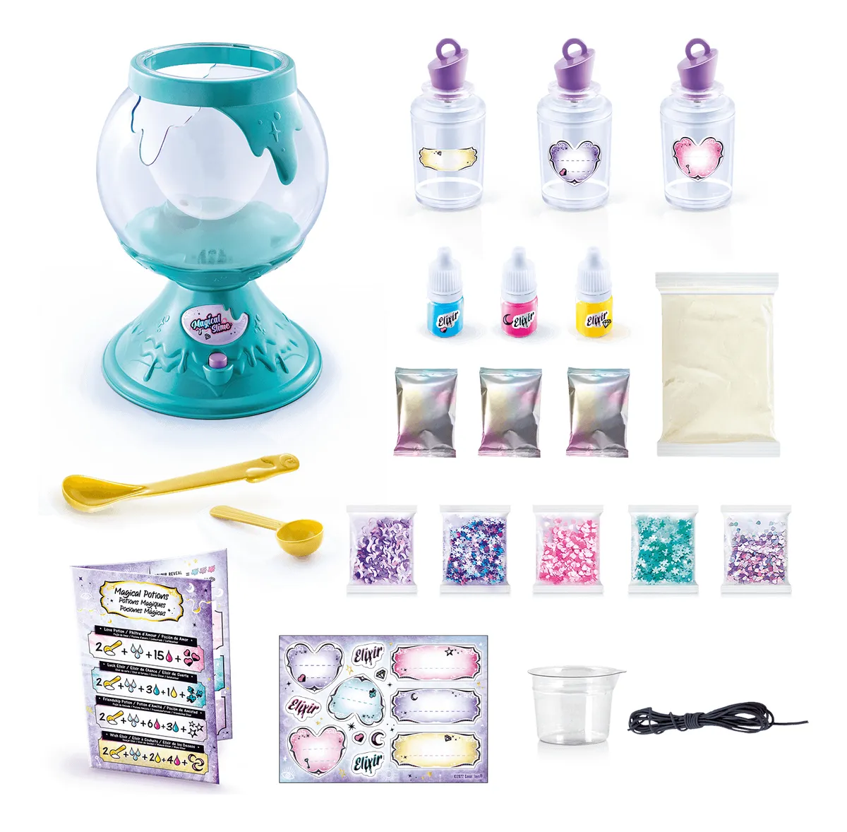 Este set viene con frascos, cucharitas mágicas, slime base y una gran variedad de ingredientes para crear pociones increíbles llenas de brillo, color y fantasía.