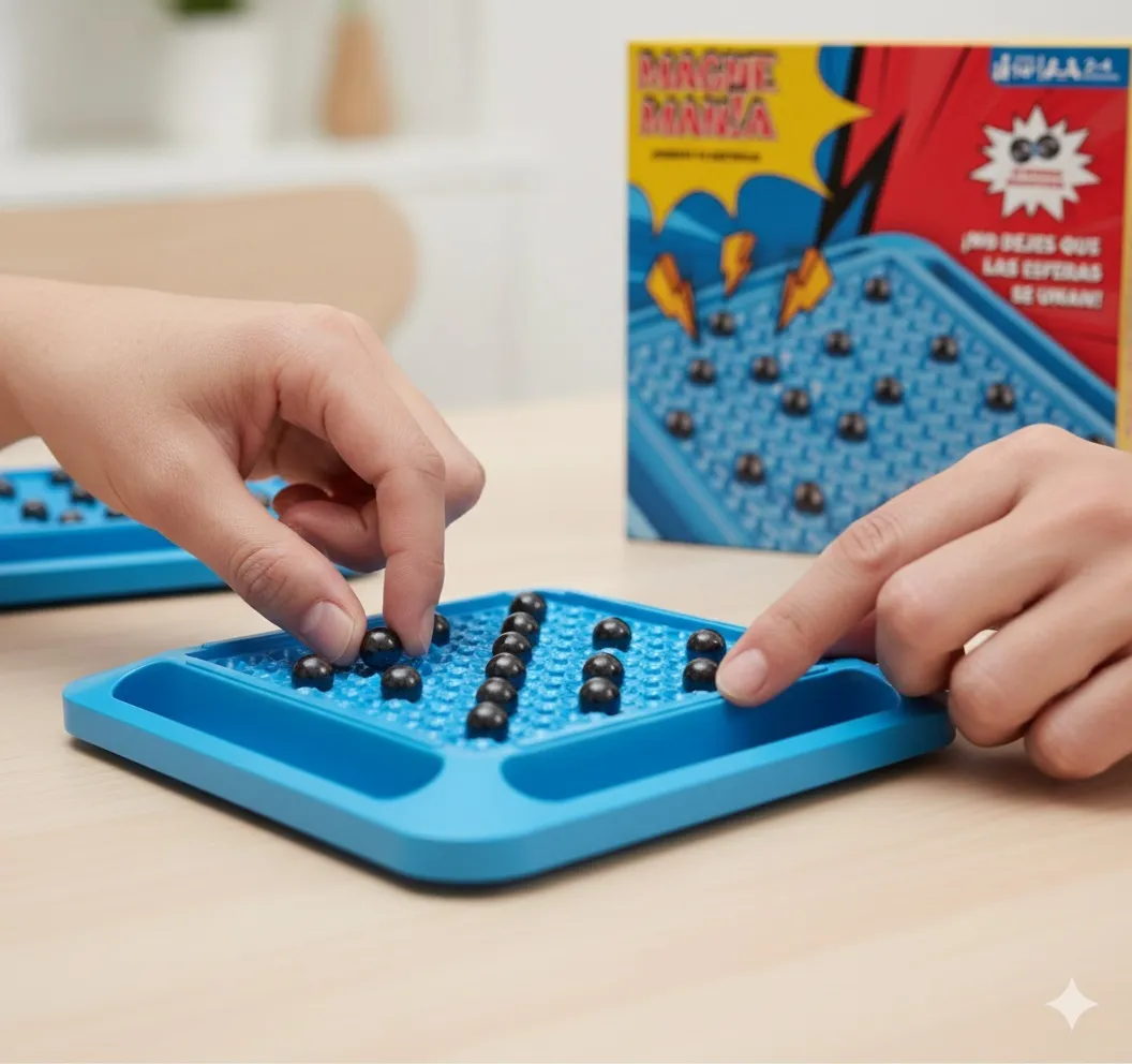 Este juego de destreza Magne Mania desafía la coordinación y la concentración de los chicos mediante 32 esferas magnéticas que deben mantenerse separadas mientras avanzan por el tablero. Es una propuesta divertida, segura y perfecta para compartir en familia con supervisión de un adulto. El diseño del tablero permite diferentes niveles de dificultad según la edad, ayudando a desarrollar motricidad fina, paciencia y pensamiento estratégico. Fabricado en materiales resistentes y adecuados para niños, pensado para un uso responsable y entretenido. + 14 AÑOS