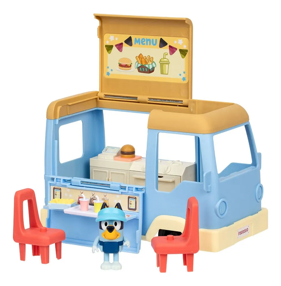 Bluey Food Truck es un juguete transformable 2 en 1 que invita a los chicos a recrear escenas del show y vivir aventuras gastronómicas con la familia Heeler. Este camión de comidas rápidas se puede empujar como vehículo y también abrirse para convertirse en un restaurante completo. El set incluye figuras exclusivas de Bingo y Bandit, diseñadas con brazos y cuerpo móviles para mayor realismo en el juego. Los chicos podrán imaginar que cocinan, sirven y disfrutan de las comidas más divertidas de la serie, fomentando el juego simbólico, la creatividad y la narración de historias. Ideal para niños y niñas a partir de 3 años, este playset combina lo mejor de los vehículos y escenarios en un solo producto, y se complementa con otras figuras y sets de Bluey para ampliar la colección.